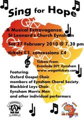 This concert included performances by local choirs Wox Vox, EOCC Children’s Choir, Oxford Analyrical and The Ad Hoc Singers, as well as Blackbird Leys Choir. It finished with a massed choir performance of Handel’s Zadok the Priest accompanied by the Hinksey Hill Farm Quartet.