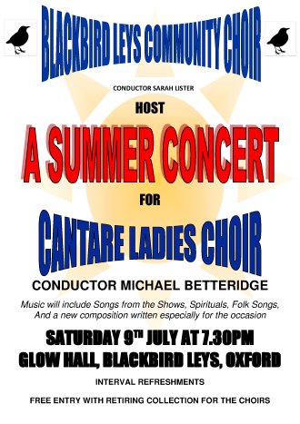 Oxford City Council ran an event in Blackbird Leys to provide information on recreation, education, training and employment. Activities took place at the Community Centre, the Leisure Centre and the Barn. The Choir performed for about 50 minutes at the Barn with pieces from our repertoire and introduced one of our new pieces — an English madrigal.